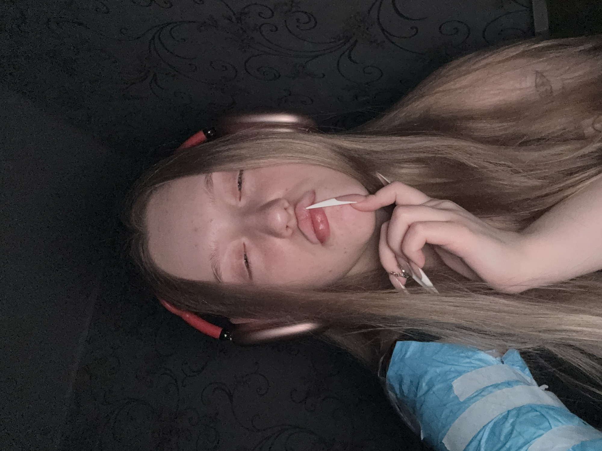 A person with long blonde hair and pale skin is lying on their side. They are wearing headphones and holding a thin, white object between their lips and a finger. A blue object wrapped with white tape is visible in the lower right corner. The background is a dark color with a patterned texture. There is no verifiable information about the location in the city of Saratov, Russia.