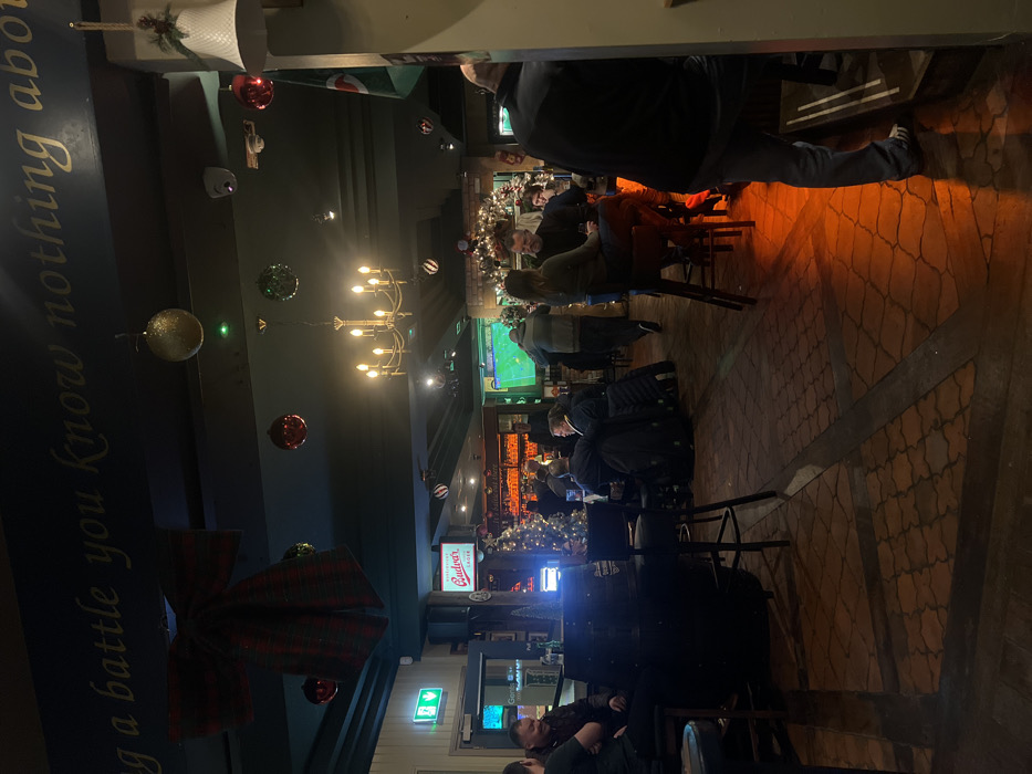 Inside a decorated pub, patrons sit at the bar, some watching a screen in the background. Christmas ornaments hang from the ceiling. A chandelier provides light. The floor is tiled with a geometric pattern. A sign for "Budvar Lager" is visible. People are dressed casually in dark clothing. A large red bow adorns the wall.