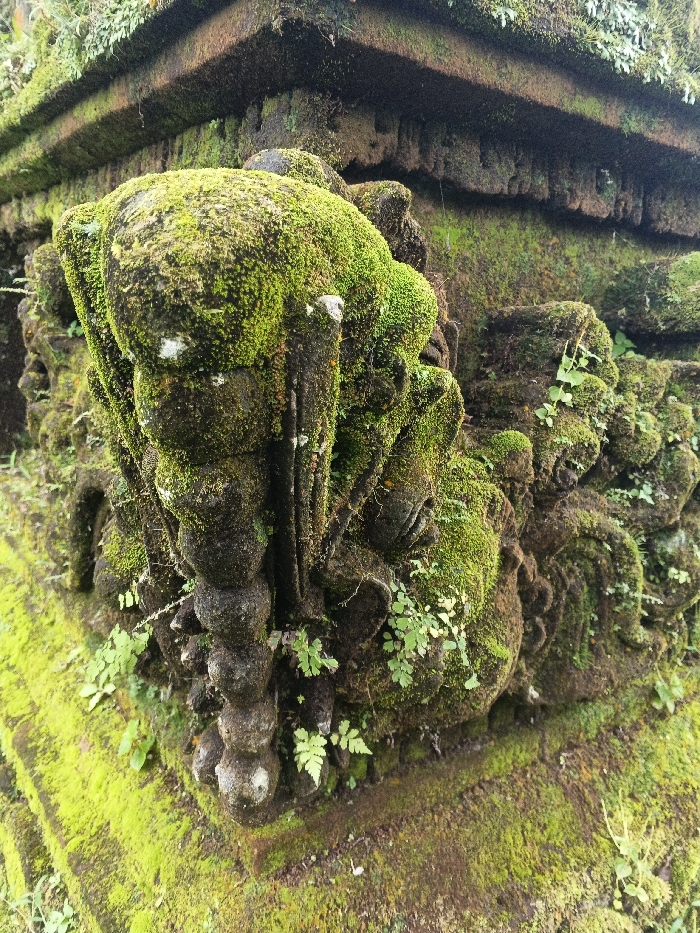 An aged stone structure covered in vibrant green moss forms a captivating scene. Intricate carvings are heavily obscured by the moss, creating a textural and visually rich surface. Small plants sprout from crevices, adding to the sense of nature reclaiming the man-made object. The architecture appears to be a corner section, with horizontal tiers adding depth. Overall, it's a detailed depiction of weathered stone and lush vegetation.