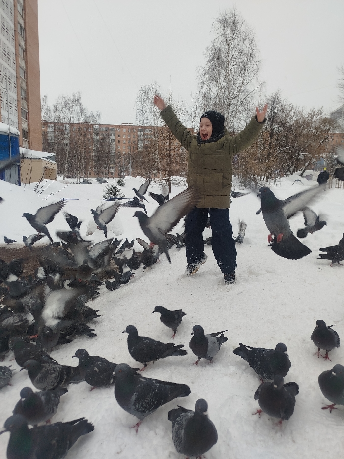 The image depicts a winter outdoor scene in Izhevsk, Russia, characterized by extensive snow cover. A single child, appearing to be male and approximately 6-10 years old, is centrally positioned, captured mid-air during a jump. The child is dressed in a dark green puffer jacket, dark trousers, and a black balaclava, with both arms raised above the head and an open-mouthed, exuberant facial expression. A large flock of pigeons (Columba livia) surrounds the child, occupying the foreground and midground. Numerous pigeons are in various stages of flight, with wings extended and motion blur visible, while others remain on the snow-covered ground. The ground is uniformly blanketed in white snow. In the background, multiple multi-story residential buildings, consistent with Soviet-era architecture, are visible. Bare deciduous trees and a small snow-covered evergreen tree are also present behind the buildings and in the mid-distance. The sky is overcast and appears white. The scene captures the child's dynamic interaction with the scattering flock of pigeons.