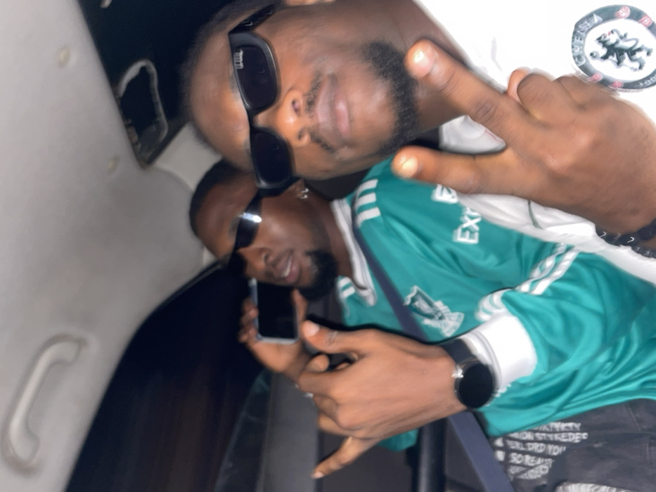 Two men are posing close together. The man at the top is wearing a white shirt with a Chelsea logo and sunglasses, flashing a peace sign. The man below is on a phone call, wearing a green and white jersey with a watch. The background appears to be inside a vehicle, possibly a car or a van. One of the men is wearing black beaded bracelets.