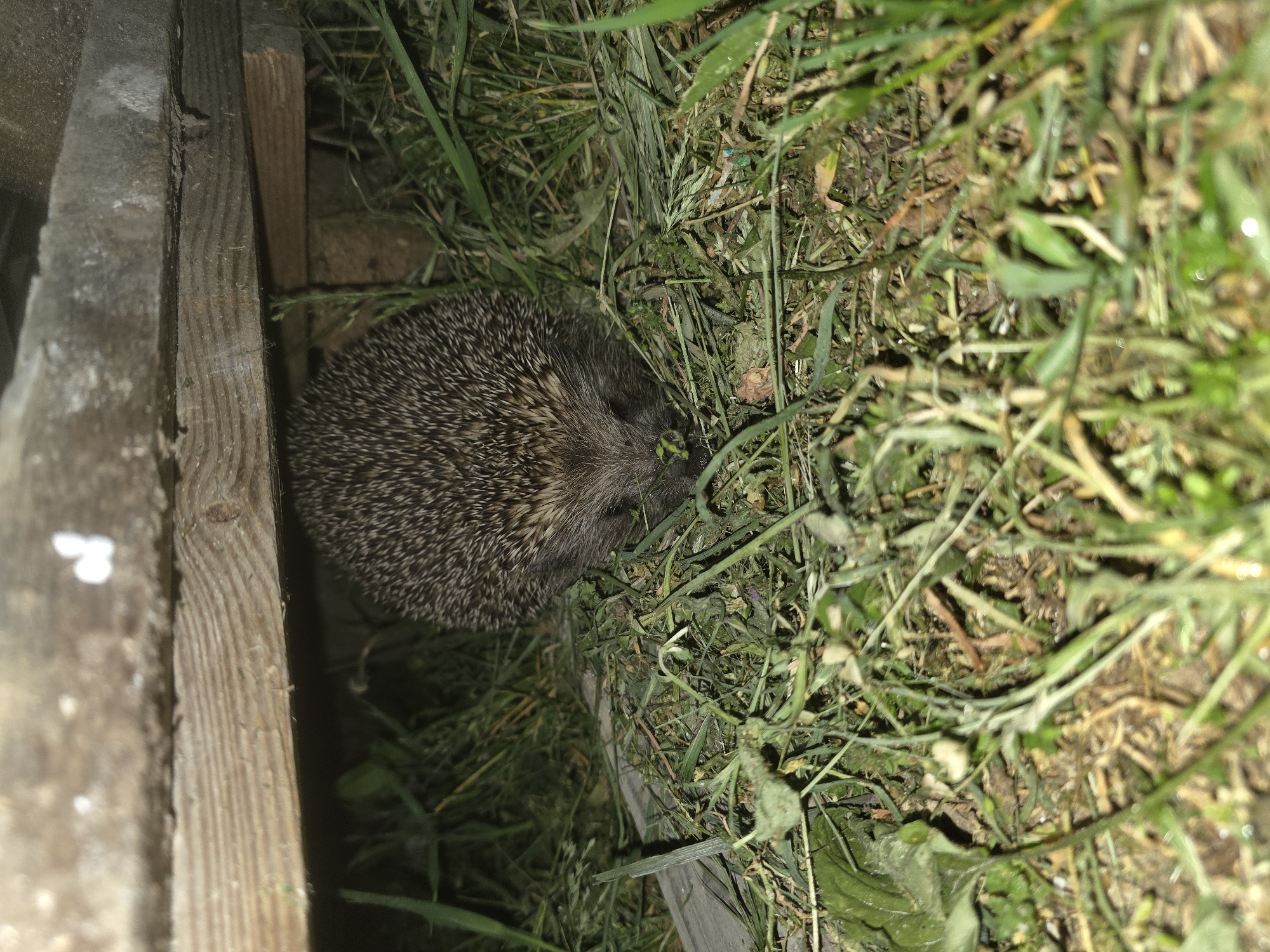 A hedgehog is located between a wooden structure and grass in an outdoor environment