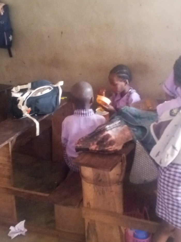The image depicts an indoor scene within a structure in Unknown, Unknown. The room features plain, light brown walls and a hard, unadorned floor. Wooden benches and desks serve as furniture. In the foreground, a child with short hair or a bald head is seated facing away from the camera, wearing a light purple checkered shirt. To their right, a second child with braided hair is seated, facing towards the right of the frame, wearing a light purple uniform-style shirt and holding a light-colored food item. A third child's lower torso and legs are partially visible on the far right, wearing a light purple shirt and a white and purple checkered skirt. A dark blue backpack with white straps is positioned on a wooden bench in the upper-left. A large, dark, irregular object, resembling raw meat or a large fish head, rests on a wooden block in the lower-middle right. A crumpled white paper lies on the floor in the lower-left, and a pink container with a blue lid is partially visible on the floor below the wooden block. The children are seated, and one is engaged with a food item; no direct interactions between individuals are discernible.