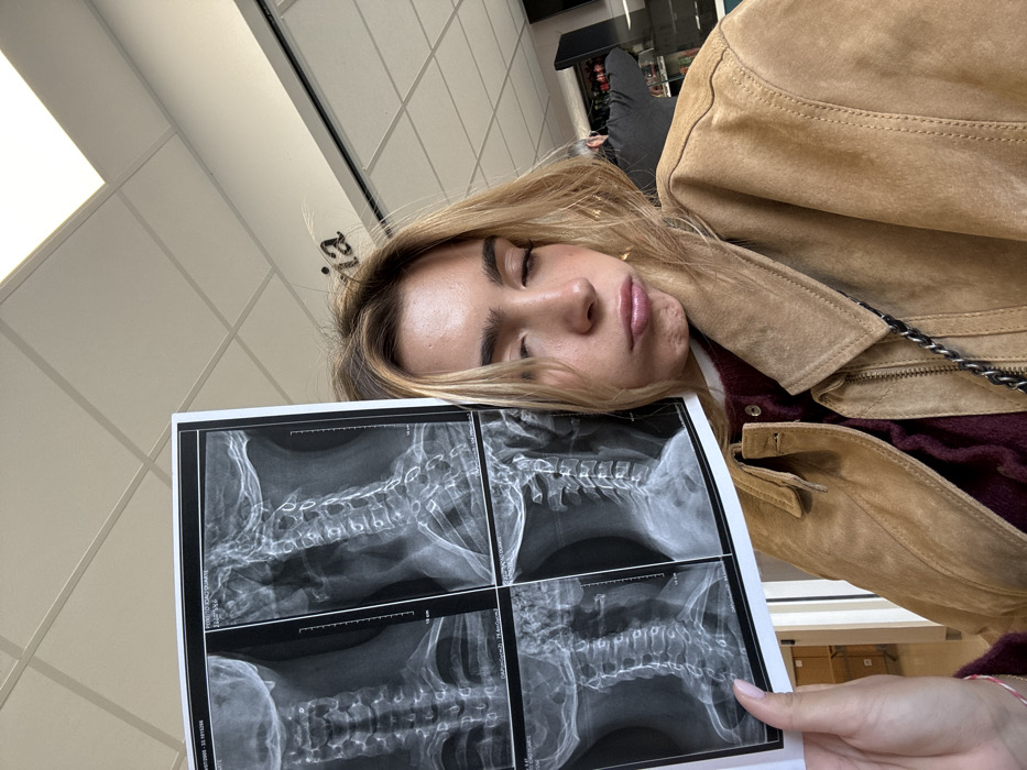 A young female, with shoulder-length blonde hair and a pouting expression, holds a large X-ray film sheet in her left hand, positioned partially in front of her face