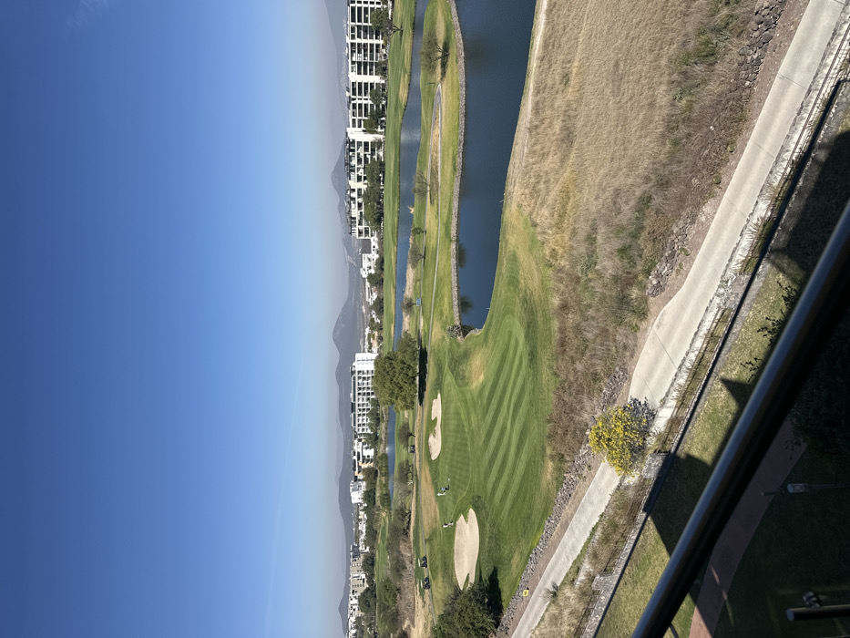 A serene, elevated view captures a golf course winding alongside a water feature, bordered by buildings against a hazy mountain backdrop. The manicured green contrasts with the adjacent terrain, divided by a paved path. A flowering tree dots the landscape, while an architectural detail partially obscures the lower right, hinting at the viewpoint.