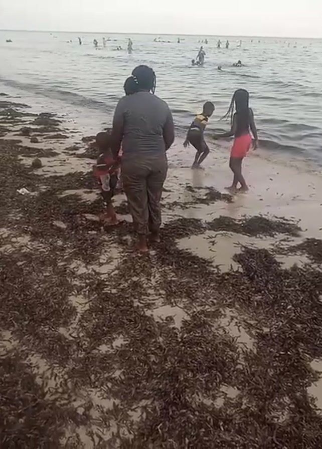 A woman and three children stand at the edge of a beach covered in brown seaweed, looking out at the ocean. Other people are swimming and standing in the water further away. The woman is wearing a gray shirt and pants, both of which appear wet and sandy. One child wears a red and black shirt, another is in pink shorts, and the third is wearing striped swimwear. The water is calm and the sky is overcast.