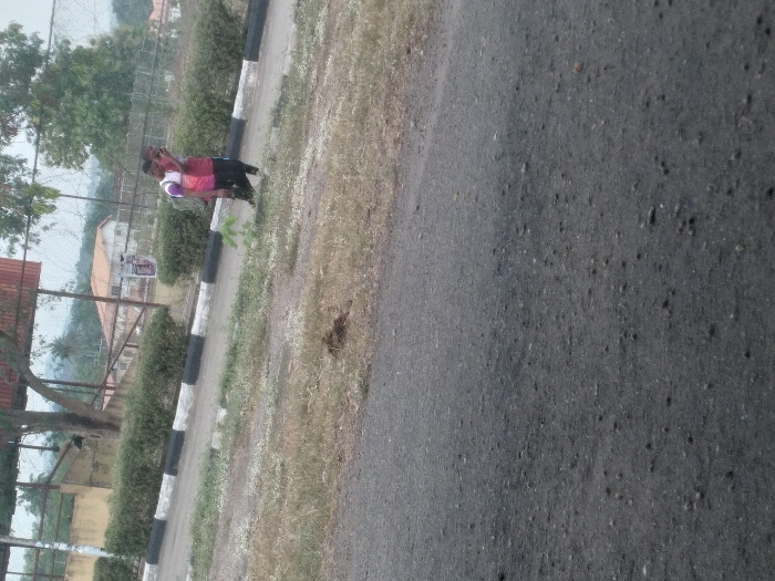 The scene depicts an outdoor environment in Osu, Nigeria. The foreground features a dark grey asphalt road surface. Immediately beyond, a curb with alternating black and white painted sections defines a boundary, separating the road from a strip of dry grass and a continuous line of trimmed green hedges. Two male individuals are visible walking from right to left behind the hedges. The person in the lead wears a red shirt over a lighter undershirt, dark trousers, and carries a dark bag on their left shoulder. The second person wears a multi-colored striped shirt (purple, white, and red) and dark trousers, also appearing to carry a bag on their back. Both individuals are in motion. In the background, a chain-link fence topped with barbed wire spans horizontally behind the hedges. Beyond the fence, a tan-colored building with a red roof is partially visible, alongside a section of another white building and dense green trees. The sky above appears overcast. A red metal structure is partially visible on the far left, behind the fence.