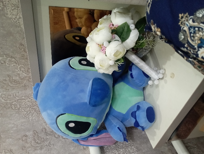 A blue Stitch plush toy rests on a table with a white bouquet of flowers