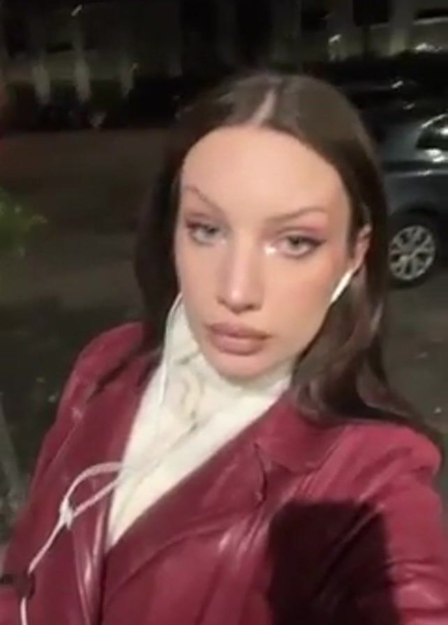 A woman is recording a selfie video outdoors at night. She is wearing a red leather jacket over a white turtleneck and white earbuds. She has long brown hair and pink makeup. There are parked cars and buildings in the background. The lighting is dim. The woman is talking, but the audio is not clear.