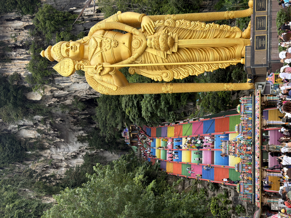 A golden statue stands tall beside a colorful staircase ascending a mountain. The staircase is painted in vibrant hues and is populated with people. The statue is intricately designed and dominates the scene, with surrounding lush green trees. The mountain backdrop reveals a rocky, textured surface. Crowds gather at the base of the staircase, suggesting a popular destination.