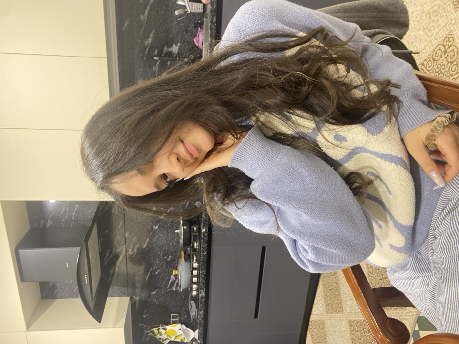 An image depicts a young female, estimated to be in her late teens or early twenties, seated indoors. She has long, wavy dark brown hair, parted centrally, cascading over her shoulders and partially obscuring the left side of her face. Her right hand is positioned against her right cheek. She is wearing a light blue knitted sweater with an off-white design on the front and striped pants. Her fingernails are light-colored and of medium length. A tan scrunchie is visible on her left wrist. She is seated in a brown wooden chair with a carved armrest. The background reveals a modern kitchen. Features include dark grey or black marble countertops and backsplash, integrated with a gas cooktop. Two pots are present on the cooktop. A black, modern-style range hood is mounted above the cooktop. Upper cabinets are light beige or cream-colored, while lower cabinets are dark grey or charcoal. To the left, a white tea towel with a yellow lemon pattern hangs on a hook. To the right, a black sink and faucet are visible, along with a small purple cloth and a white utensil holder. The flooring consists of light-colored, patterned tiles with a geometric design. The indoor setting does not contain sufficient visual data to specifically identify the city of Yerevan, Armenia.