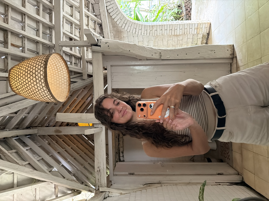 A woman takes a selfie in a bright, whimsical space. She holds an orange phone with an illustration on the back. Her hair is long and wavy. She wears a striped tank top and light-colored pants with a dark belt. The architecture is mainly white wood, with a hanging woven lamp on the left. A round window above reveals green foliage. The setting looks like a unique cafe or building interior.