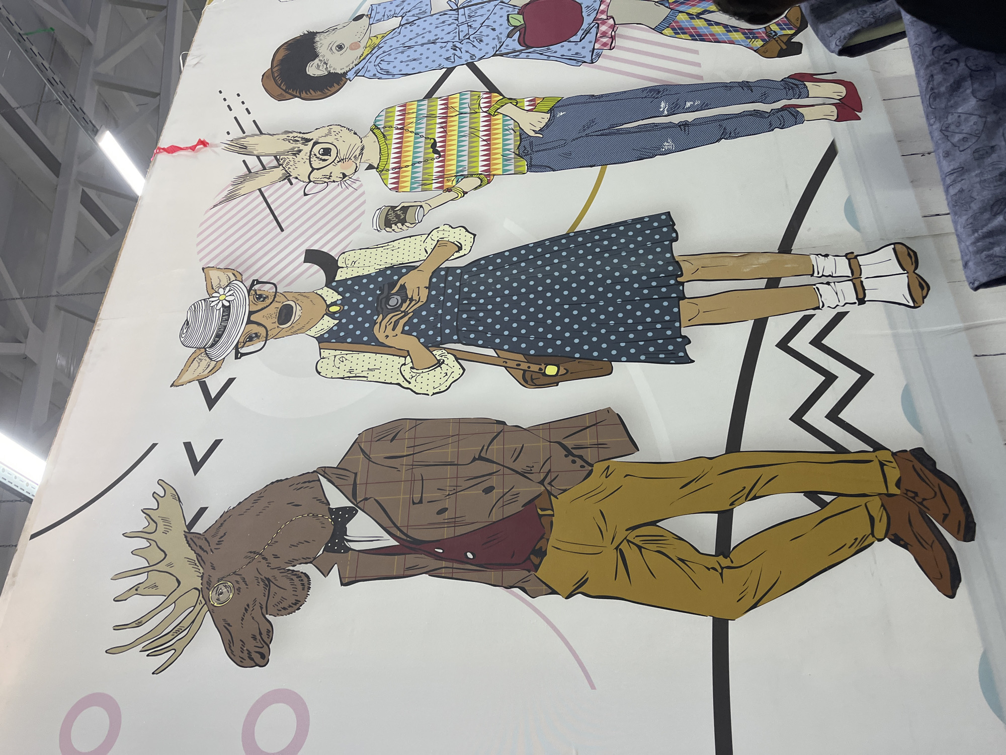 A large, brightly lit indoor display panel in Ново-Никольское, Russia, depicts four anthropomorphic animal figures in contemporary fashion against a white background with abstract black lines and geometric shapes