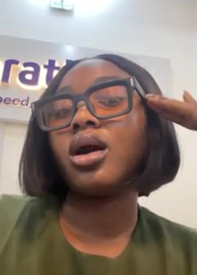 A young woman with dark skin and short black hair wearing square black glasses and an olive green shirt is centered in a close-up shot
