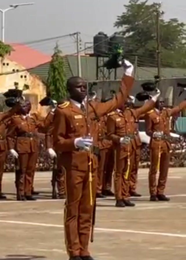 group of people dressed in tan military uniforms standing at attention. The uniforms have gold trim. The people in the front are holding swords and wearing white gloves. At the direction of one of the officers, they salute by raising their left arms up and touching the side of their headwear. Some of the people behind the front row are holding rifles. The setting appears to be outdoors on a paved surface. In the background there is a building with a red roof and a water tower. The sky is clear and blue.