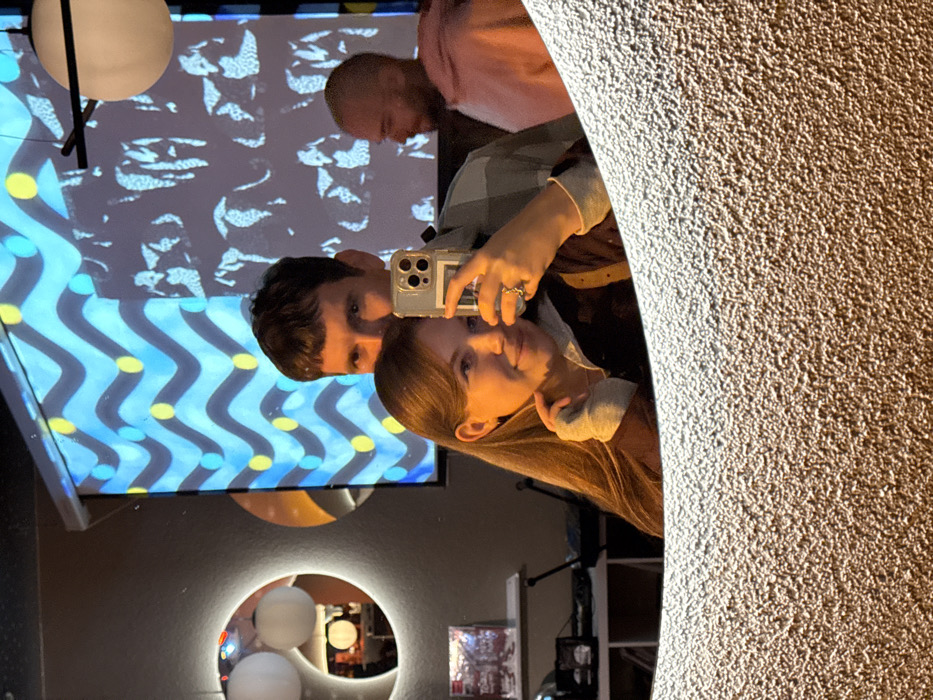 A selfie captures a man and a woman in a mirror. The man, with dark hair, stands to the left, while the woman, with long blonde hair, is next to him and holds the phone. Reflected behind them is a screen with a blue wavy pattern, and a man behind him with a pink shirt. The mirror also reflects a room with a round, illuminated mirror. A textured, beige surface fills the right side of the frame.