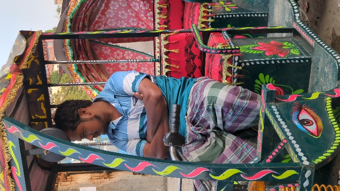 A lone adult male is depicted seated in the driver's position of a decorated three-wheeled rickshaw in Keraniganj, Bangladesh