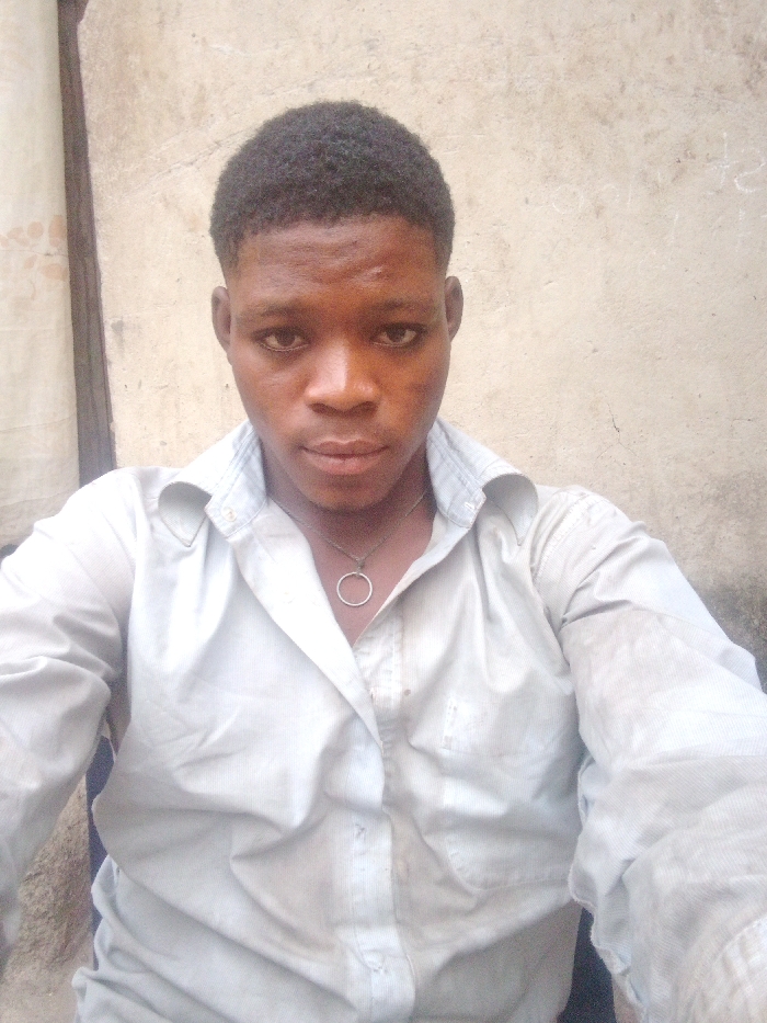A forensic portrait of a young adult male is captured in a chest-up view, located in Akwanga, Nigeria. The subject possesses dark skin, short dark hair styled with a fade, and dark eyes. A subtle horizontal line is visible on his forehead. He wears a light-colored, wrinkled, long-sleeved collared shirt, unbuttoned at the top to reveal a metallic necklace with a simple circular pendant. The background consists of a textured, light-colored wall, possibly concrete or stucco, displaying minor imperfections and faint, illegible markings on the right side. A dark, vertical architectural element is partially visible along the left edge of the frame. The subject maintains a direct gaze towards the camera with a neutral facial expression.
