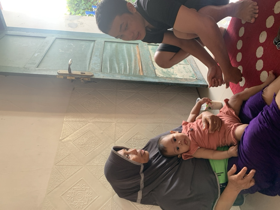 An adult female, an infant, and a male youth are positioned indoors within a residence in Kecamatan Pati, Indonesia