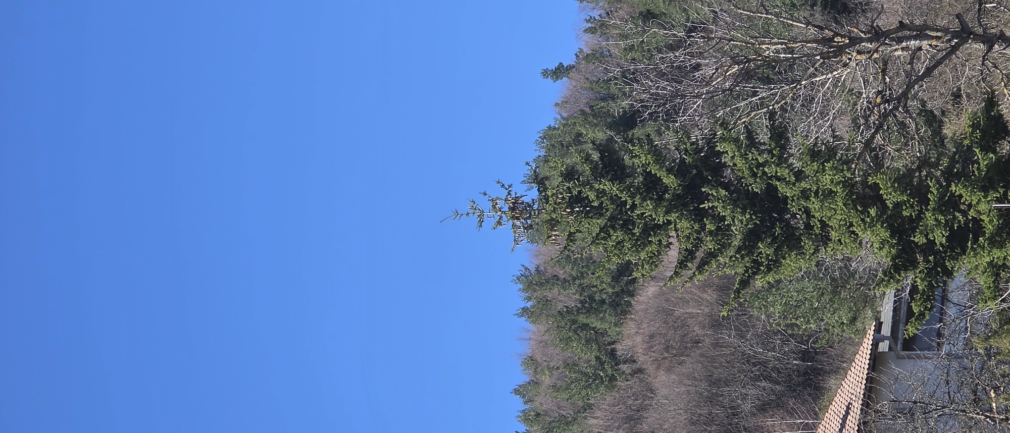 scene in Belchin, Bulgaria. It features a hillside covered with a mix of coniferous and deciduous trees. Some of the deciduous trees are bare, indicating it may be late autumn or early spring. Part of a building with a tiled roof and windows is visible at the bottom right corner. The sky above is a clear blue. The image appears to be taken from a lower vantage point, looking up at the hillside.