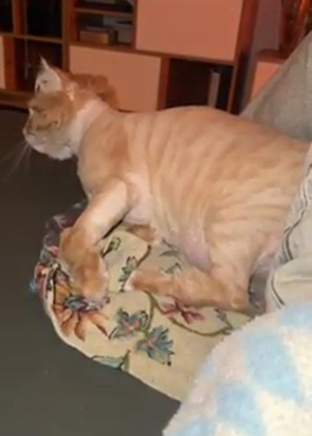 n orange tabby cat sitting on a floral patterned cushion. The cat has been shaved, leaving a mane-like tuft of fur on its head and a furry tail. A hand wearing a blue and white striped sleeve points to the cat's shaved belly. The cat is lying on the lap of a person whose legs are covered by a blue and white blanket. In the background, there is a wooden shelf unit and a plant. The lighting appears to be warm, possibly from a nearby lamp.