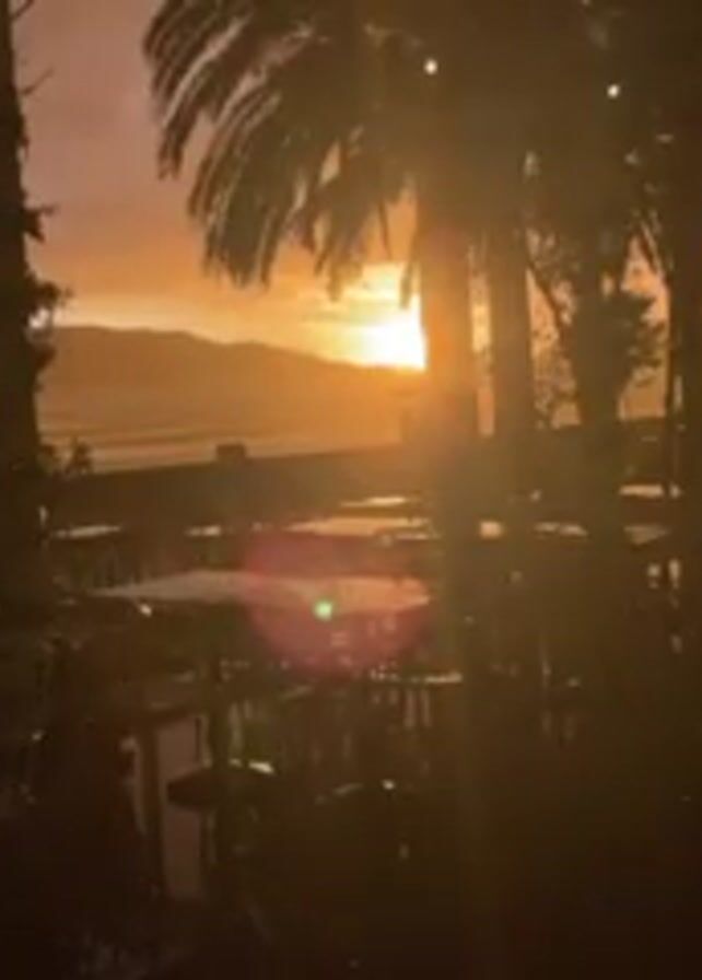 deserted outdoor seating area with tables and chairs, possibly belonging to a restaurant or cafe, overlooking a beach and ocean at sunset. Palm trees and other trees line the area, and string lights are visible overhead. It appears to be raining or wet, as the tables are glistening with moisture. The sun is setting over a distant landmass, creating a warm, orange glow in the sky. There are no people visible in the frame.
