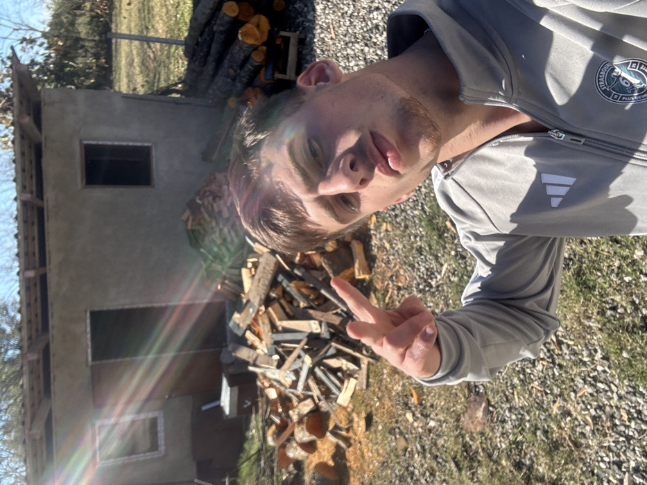 This is a daylight selfie image taken in Chitaushkuri, Georgia, featuring a young adult male in the immediate foreground. The individual has short brown hair and light stubble on his chin and jawline. He is wearing a light grey zippered athletic jacket with an Adidas logo on the right chest and a "STRASBOURG" club crest on the left chest. His right hand is raised, forming a V-sign, and his lips are slightly pursed. Strong sunlight from the upper left creates prominent lens flares across the image. In the mid-ground, behind the individual, stands a single-story, unrendered concrete or stucco building with a corrugated metal roof supported by exposed rafters. The building features an open doorway on its left side and two rectangular window openings, one to the right of the door and another further right. To the left of the building, a dark object and a white cooler are visible on the ground. Directly in front of the building, a substantial pile of cut and split firewood is present, with sawdust scattered on the surrounding ground, indicating recent processing. To the right of the building, a separate stack of larger, unsplit logs is visible. The ground in the scene is composed of gravel, dirt, and sparse dry grass. Distant trees and a clear blue sky are visible in the background.