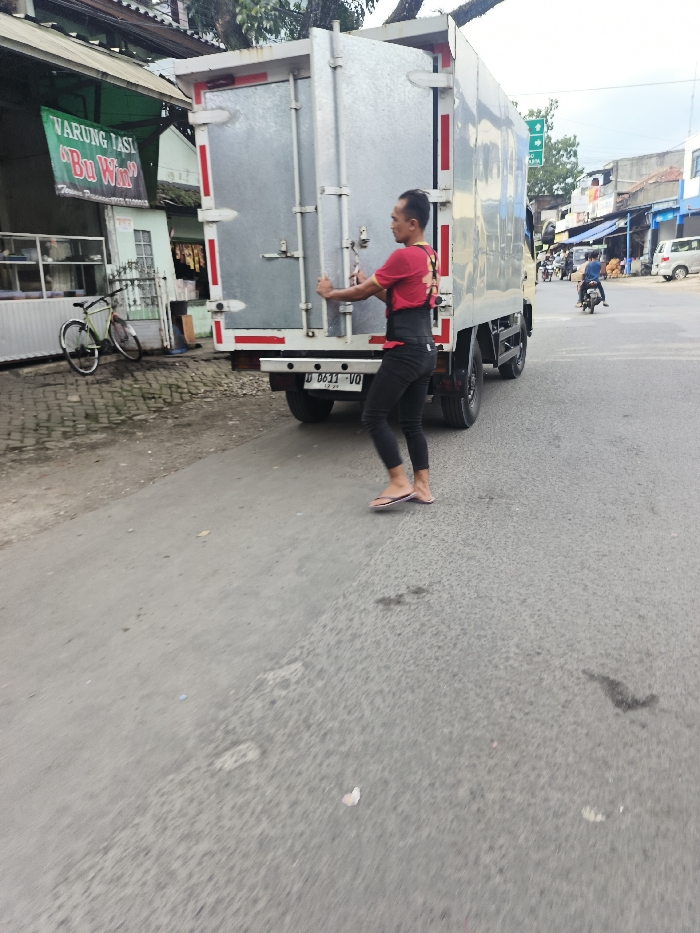 The image depicts an urban street scene in Bandung City, Indonesia, specifically near Taman Pramuka. In the foreground, an adult male stands behind a stationary light-colored box truck, facing away and slightly to the left. He is wearing a red short-sleeved t-shirt, black ankle-length leggings, and black and pink flip-flops. A black back support harness with shoulder straps is visible on his torso. His hands are gripping the two vertical handles of the truck's closed rear doors, which feature red and white reflective strips along their edges. The truck's license plate, D 8611 UO, is affixed to the lower rear bumper. To the left of the scene, a building with a green awning displays a sign that reads "WARUNG TAST 'Bu Win'" with additional text "Taman Pramuka No. 119/180". A light green and black bicycle is parked on the unpaved area directly in front of this building. The asphalt road surface extends from the foreground into the distance. In the middle ground, two individuals on motorcycles are observed moving away from the camera. Various commercial establishments or dwellings with corrugated roofs and awnings line the right side of the street. A green street sign with white text, including the word "Jaya," is visible overhead on the right. The sky is overcast.