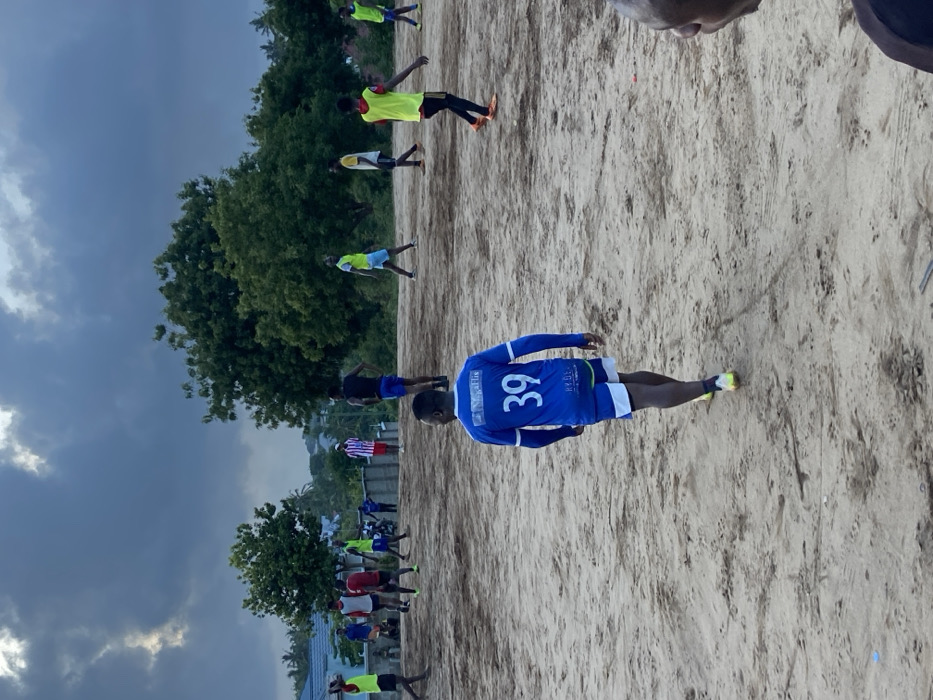 The image displays an outdoor scene in what appears to be a residential or semi-urban area of Dar es-Salaam, Tanzania. The setting is a large, unpaved, sandy-brown dirt field, likely used for sports. The sky is heavily overcast with significant cloud cover in shades of dark and light grey. Approximately 15 to 20 individuals, predominantly adult males, are present on the field. In the foreground, facing away from the camera and slightly to the right of center, is a male wearing a long-sleeved blue athletic jersey with white accents, displaying the number "39" in white on the back. The jersey also features logos, including "SasaFire" on the upper back and "HYDE" below the number. He wears blue shorts with white and green trim and bright yellow-green athletic cleats, and is depicted walking across the field. Across the mid-ground and background of the field, numerous other individuals are scattered. Many are wearing athletic attire, including bright yellow or neon green training bibs over various colored shirts such as red, white, black, and blue. They are in postures consistent with standing, walking, or observing, indicating participation in or observation of a casual sports activity, likely soccer. One individual in the far-left background wears a red and white striped shirt. The top of a bald head is partially visible in the extreme lower right foreground, belonging to another person. The background features a dense treeline of green foliage. Behind the trees, particularly on the left side, are glimpses of low-rise buildings with light-colored walls and dark roofs. A low, light-colored wall or fence runs horizontally across the mid-left background, separating the field from the structures beyond. No specific ball or explicit in-game action is discernible, but the overall arrangement of people on the field strongly suggests a sporting event or practice session.