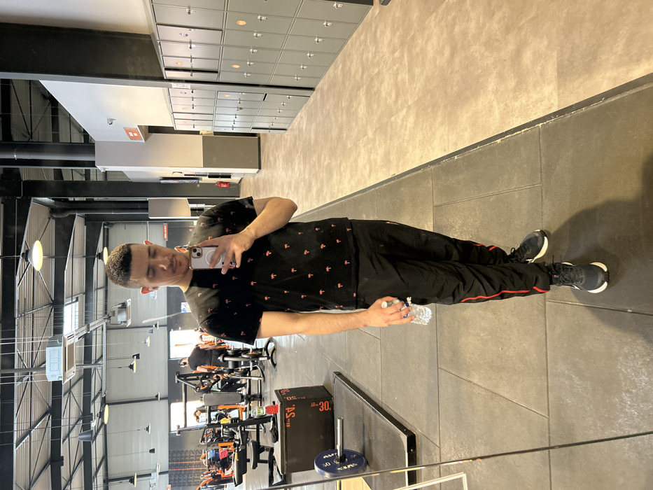 The scene depicts the interior of a Basic-Fit gym located in Hœnheim, France. A male individual, appearing to be in his 20s or 30s, stands centrally, taking a mirror selfie with a white smartphone held in his right hand. He wears a black short-sleeved t-shirt with a repeating pattern of small red palm trees, black athletic pants with a single red stripe running down the outer seam of each leg, and black athletic shoes with white soles. A clear plastic water bottle with a white cap is held in his left hand. Light-colored earbuds are visible in both ears, and his gaze is directed downwards at the phone screen. The immediate foreground features a black rubber mat floor. To the left, various gym equipment is visible, including orange-colored exercise machines bearing "Basic-Fit" branding, a barbell with a blue weight plate, and a black plyometric box marked "30cm". Several other individuals are present in the background, utilizing gym equipment. The gym ceiling is industrial, with exposed ducts and overhead fluorescent strip lighting, and a large window or opening allows natural light from the upper left. To the right, the flooring transitions to a lighter, possibly linoleum, surface. A long bank of grey metal lockers, stacked three high, lines a hallway on the right side of the frame. A red fire extinguisher and a wall-mounted screen are visible further down this hallway.