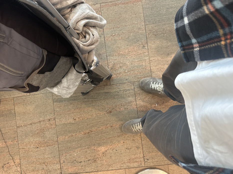 - "A first-person, downward-facing view captures the lower half of an individual standing on a light brown tiled floor within what appears to be an airport terminal in Israel" by FM-EXOi83, licensed under CC BY 4.0