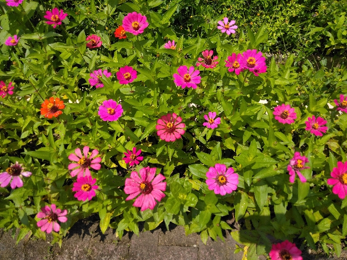 Located in Nathene, Laos, this image presents a high-angle view of a dense patch of flowering plants, primarily Zinnia species. The scene is dominated by numerous magenta and fuchsia flowers, each featuring multiple layered petals surrounding a prominent yellow-orange central disk. Scattered among these are a few vibrant orange flowers of similar morphology. The blossoms are interspersed within a lush bed of bright green, ovate to lanceolate leaves, some appearing to have small water droplets. The plants are well-lit by direct sunlight, casting subtle shadows. Along the bottom edge of the frame, a dark gray paved surface, possibly composed of bricks or concrete, is visible, indicating the boundary of the garden bed. No individuals, specific actions, or overt interactions are present in the frame. The immediate background consists of blurred green foliage.