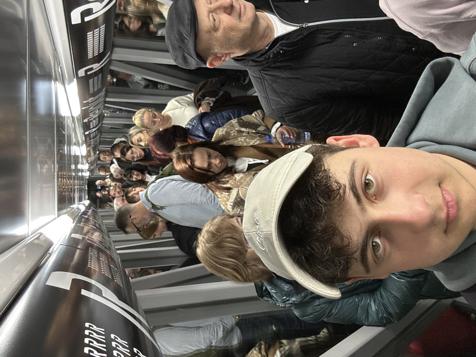The image depicts a crowded passenger jet bridge at Barcelona-El Prat Airport (BCN) in El Prat de Llobregat, Spain. The scene is illuminated by overhead artificial lighting. A young male in the immediate foreground, positioned centrally, faces the camera. He wears a light blue hooded sweatshirt and a light-colored baseball cap with "Barça" embroidered in script. He has dark, curly hair and light brown eyes. Behind and around this primary subject, a dense crowd of approximately fifty individuals, consisting of adults of various ages and genders, fills the confined passageway. They appear to be in transit, moving forward. To the right of the foreground male, an older male wears a black flat cap and a black quilted jacket. Directly behind the foreground male, a woman with auburn hair wears a dark teal puffer jacket. Further back, a woman with reddish-brown hair, wearing a patterned jacket, holds a clear plastic water bottle. Other visible individuals include a man with a beard and glasses wearing a light blue shirt and a backpack in the middle-left. The environment consists of the metallic interior of the jet bridge, featuring an overhead ceiling with integrated lighting. Black panels line the upper walls, adorned with white graphical elements, including repeated "R" characters and other patterns, consistent with airport or airline branding. The overall impression is of a busy boarding or disembarking process within a controlled, tunnel-like structure.
