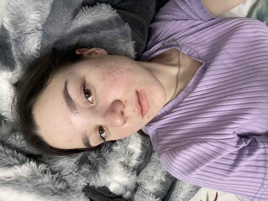 A young female, appearing to be in her late teens or early twenties, is depicted in a close-up, top-down shot, presumably a selfie. She has dark brown hair and fair skin, which displays multiple red lesions, indicative of acne or skin inflammation, across her forehead, cheeks, and nose. Her brown eyes are open and directed towards the camera, and her light pink lips are slightly parted. She is wearing a light purple, ribbed, short-sleeved V-neck top and a thin silver-colored chain necklace. The subject is positioned against a fuzzy, gray and white patterned blanket or throw. A small section of a white sheet or pillowcase with a subtle green and red pattern is visible in the lower left corner of the frame. The scene is an indoor setting, likely a bedroom or living room. The specific location within the city of Chaikovsky, Russia, cannot be determined from the visual information provided.