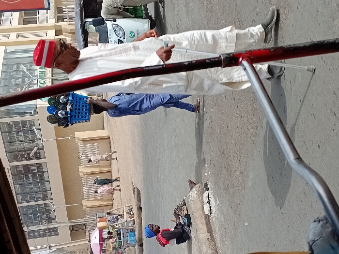 The image presents a daytime street scene in Sani Mai Nagge, Nigeria, viewed from a low perspective, partially obstructed by a red vertical bar and a silver horizontal bar in the foreground. In the mid-ground, an adult male walks from right to left, wearing a white traditional tunic and trousers, dark grey slip-on shoes, sunglasses, and a red cap with white horizontal stripes. He uses a silver crutch under his left arm, with his right hand in his pocket. Immediately behind him, a younger male, dressed in a blue traditional tunic and trousers, carries a blue plastic basket filled with various colored flip-flops on his head. To the far left, a young individual with a blue head covering, a red top, and dark patterned pants sits barefoot on a low concrete curb, looking towards the viewer while manipulating items on their lap. To the right, a white and green motorized tricycle is partially visible, with a person standing nearby. The background features a multi-story building with a light-colored facade and numerous large glass windows. Text on the building includes "SANI MAI NAGGE" and "KITCHEN &". A light-colored, decorative fence runs in front of the building. Several male pedestrians in light-colored traditional garments walk on an unpaved area adjacent to the building. To the left, a small street vendor's stall with a pink umbrella and displayed items is visible. The environment is illuminated by natural daylight, casting shadows.