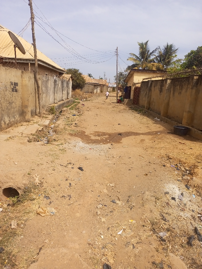 The image depicts an unpaved residential street in Sabon Tasha, Nigeria, under a bright, partly cloudy sky
