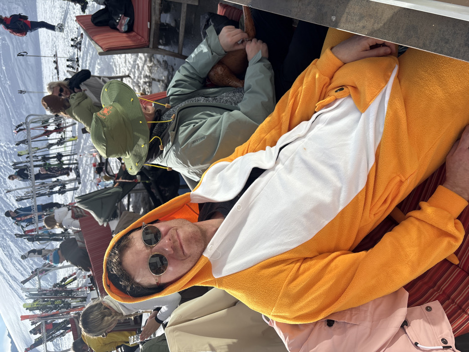 The image captures an outdoor, sunlit scene at a ski resort in St. Christoph, Austria, featuring a bustling social area on a snow-covered mountain. In the foreground, a male subject is seated, wearing a bright orange and white hooded fleece onesie with a white belly panel secured by white buttons. He wears round, reflective sunglasses and looks directly at the camera with a slight smile. To his right, a second individual is partially visible, seated, wearing an olive-green wide-brimmed hat adorned with yellow studs and an olive-green jacket. This individual is actively engaged in handling a dark brown, possibly leather, object with both hands. The immediate setting includes outdoor seating with red-striped cushions and wooden table surfaces. In the midground, multiple other individuals are seated at similar outdoor tables, some with drinks. Behind these tables, numerous sets of skis and ski poles are stored vertically in metal racks on a snow-covered area. The background reveals a wide, snow-covered mountain slope under a clear sky, with additional skiers and pedestrians visible across the landscape. Shadows are cast across the snow and seating area, indicating bright sunlight.