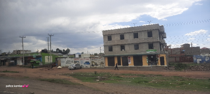 An unfinished three-story building sits on a street corner, its ground floor storefronts closed. A man walks on the sidewalk. Across the street, a row of low, green-roofed buildings stands alongside a painted wall with car advertisements. Power lines stretch across a cloudy sky. The ground is dirt and grassy, with scattered debris. A car is parked near the wall.