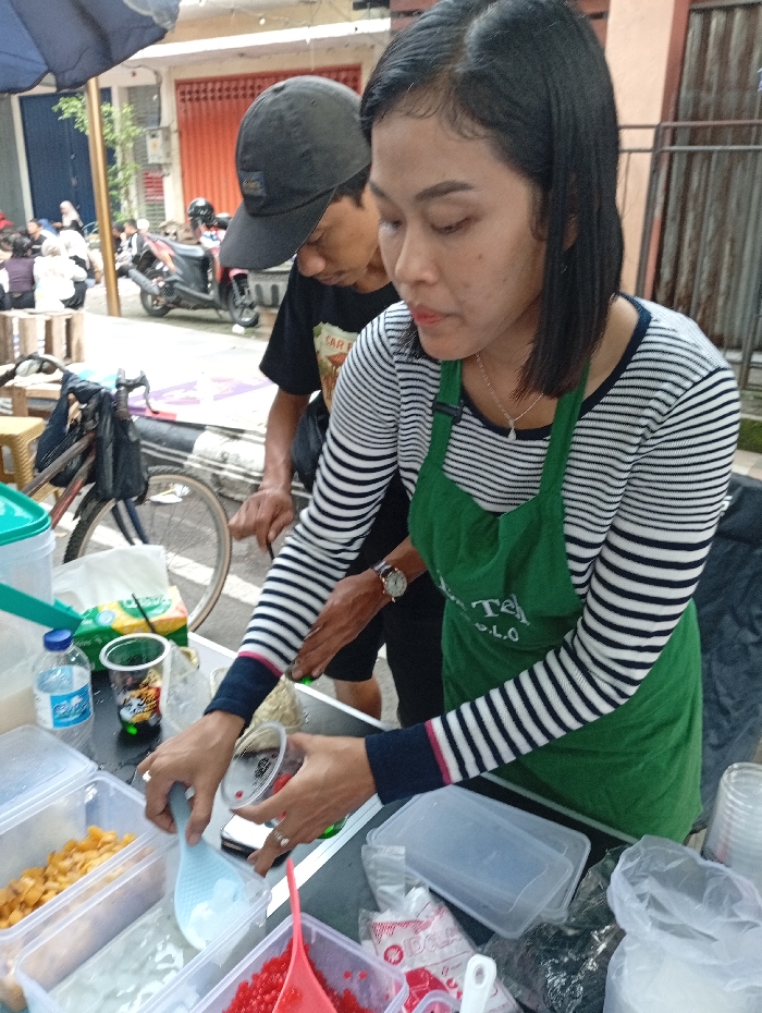 - "A woman wearing a striped shirt and green apron works at an outdoor food stall, adding ingredients to a plastic cup" by FM-4sN6B3, licensed under CC BY 4.0
