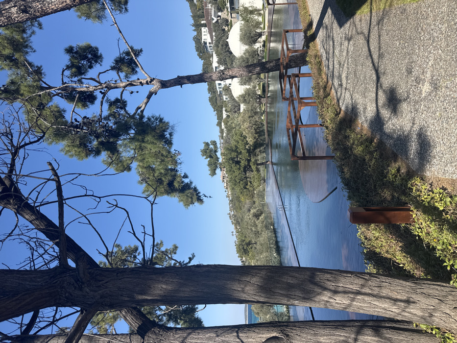 This image depicts a serene, sunlit landscape at a luxury coastal resort in Bodrum, Turkey. The scene is dominated by a large, multi-level infinity pool or water feature with dark blue-green water, reflecting the clear, vibrant blue sky overhead. In the immediate foreground, two thick-trunked trees, likely pines, stand vertically on the left, casting prominent shadows. The leftmost tree features mostly bare, dark branches extending upwards, while the one beside it has some green pine needles and cones. To the right of these trees, a light-colored, pebbled pathway curves gently towards the right edge of the frame. This path borders a strip of low-growing green shrubbery, within which a short, square, dark brown post is visible. Shadows from overhead trees are cast across the pathway. The water feature in the midground includes several distinct dark brown, geometric platforms or structures at or just below water level, particularly on the right side, suggesting seating or sunbathing areas. Beyond the main water body on the left, a sliver of the actual Aegean Sea with lighter turquoise water is visible, with a faint landmass or island on the horizon. The background reveals a verdant hillside densely covered with various green trees and shrubs. Integrated into this lush landscape are numerous modern, white-colored buildings, appearing to be villas or resort accommodations. Some of these structures feature distinctive domed roofs. The entire scene is bathed in bright natural sunlight, creating stark shadows and highlighting the clear blue sky above. No people are visible, and no actions or interactions are taking place.
