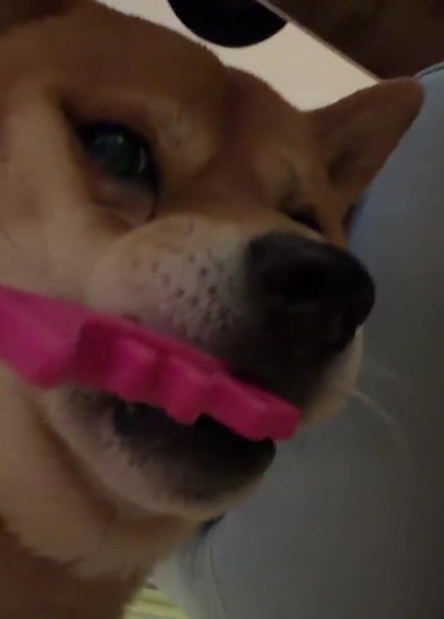 - "Shiba Inu dog chewing on a pink, rubbery, bone-shaped toy" by FM-GqPP83, licensed under CC BY 4.0