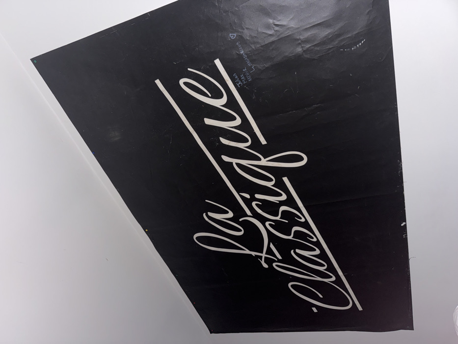 A large, rectangular black banner featuring white text is affixed to a plain white wall or ceiling. The banner displays "La Classique" in a prominent white cursive font, underlined. In the lower right corner, smaller handwritten white text reads "Julian", "Max", "Arthur", and "L MagasinClub", followed by a small heart symbol. The banner exhibits wrinkles, minor smudges, and slight discoloration. It is secured by multiple small, colored pins visible along its top and left edges. The image is captured from an upward, oblique angle, presenting the banner diagonally across the frame against the uniformly lit white background. No individuals, actions, or direct interactions are visible. The presence of "L MagasinClub" identifies the location as being within or directly associated with **Le Magasin Club, 124 Rue de Rivoli, 75001 Paris, France**.