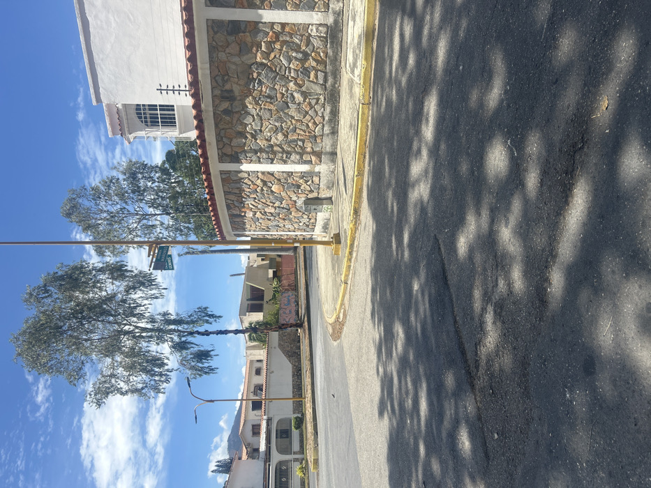 An outdoor, eye-level photograph captures a sunny street intersection identified by street signs as Calle 128 and Avenida 156 (Géminis) in Valencia, Venezuela. The sky is clear blue with scattered white clouds, and bright sunlight casts distinct, dappled shadows from overhead trees across the dark grey asphalt road. On the right side of the image, a residential property is fronted by a curved perimeter wall constructed from irregularly shaped, multi-colored stones. This wall is topped with a red terracotta-tiled coping and a white stucco section. Above the wall, the building itself is white, featuring a curved balcony with white security bars and additional security measures, including an electric fence and vertical anti-climb spikes. A tall yellow pole, holding the green street signs, stands at the edge of the curb next to this wall, with a small grey utility box at its base. The asphalt road, showing minor wear and patches, forms an intersection or curve in the foreground and extends into the background. Yellow-painted concrete curbs delineate the edge of the road. To the left, a second yellow pole with a street lamp is visible. Further down the street, various residential structures with light-colored walls and red-tiled roofs are present, some featuring security gates. A low wall with graffiti is visible in the mid-ground on the left. Several tall, slender trees with sparse green foliage are scattered throughout the scene, notably one large tree centrally located on the left side of the street, contributing to the shadows. Distant hills are visible on the horizon beneath the clear sky. No individuals or vehicles are present in the scene.