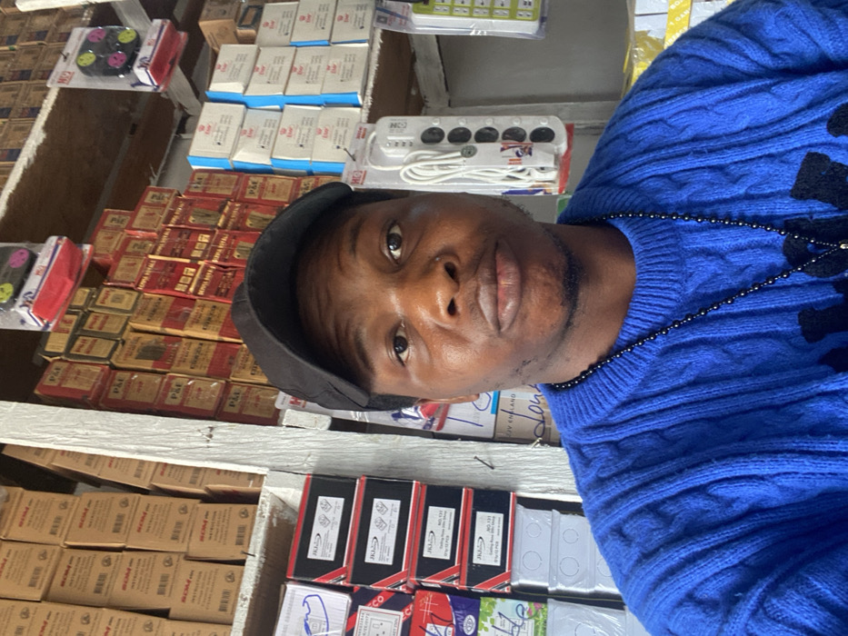 A young adult Black male is depicted in a mid-shot photograph, appearing to be inside an electrical or general goods supply store in Ogidi, Nigeria