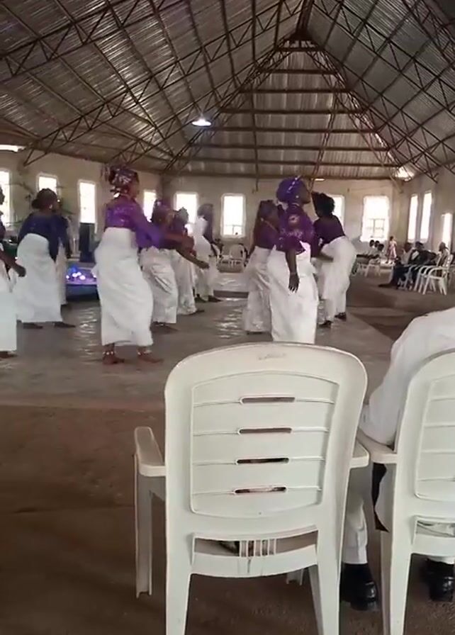 In a spacious room with a high, corrugated metal roof, a group of women are dancing. They are uniformly dressed in white wraps and purple tops, with matching head coverings. The room has multiple windows providing natural light. In the foreground, two white plastic chairs are visible, with a person seated in one, facing towards the dancers. Other individuals are seated further back, observing the dance. The floor appears to be a light brown dirt.