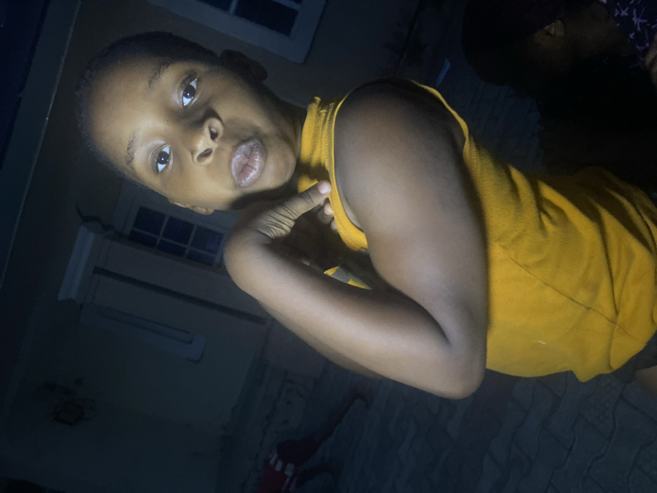 A young child in a yellow tank top is angled in the frame. They have dark skin, short hair, and are gazing toward the camera with their lips slightly parted. Their right hand is near their neck. The background is dimly lit, but a window and what appears to be part of a bed are visible. Someone or something dark is in the upper right corner.