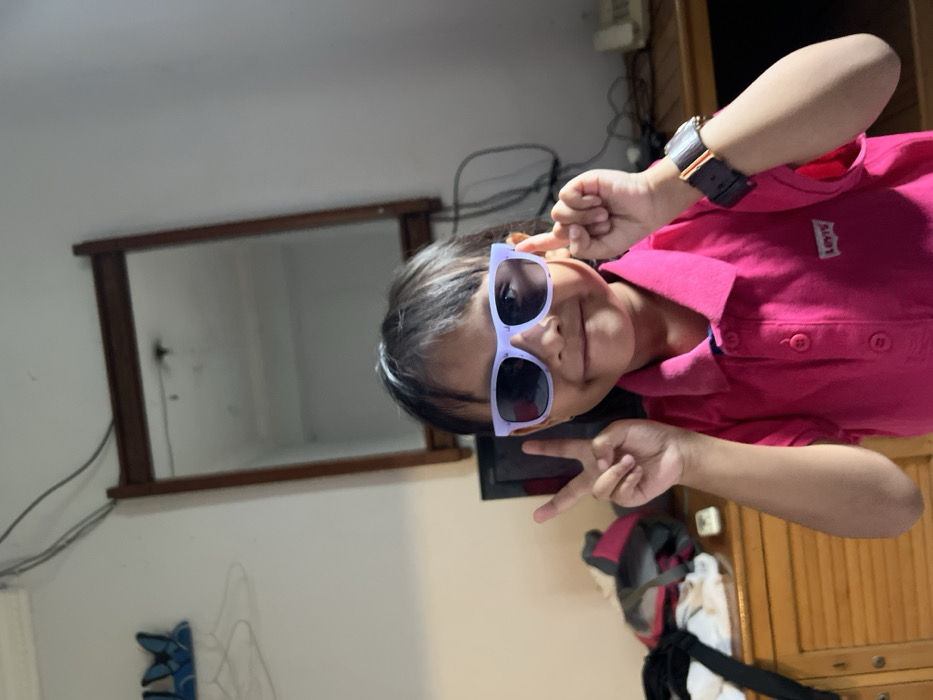 A child wearing purple sunglasses and a pink Levi's shirt poses for a selfie. They are holding up two fingers in a peace sign. A watch is visible on their left wrist. Behind them, there's a mirror mounted on the wall, along with some electronic cords. A gray and red backpack rests near wooden cabinet doors. The room appears to be a casual indoor setting.