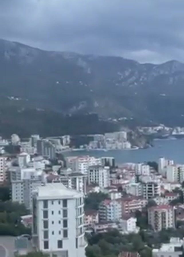 city nestled along a bay surrounded by mountains on a cloudy day. The city is densely populated with buildings, mostly white or light-colored, with some having red tile roofs. Mountains loom in the background. The water in the bay appears calm. The perspective is elevated, suggesting the video was taken from a high vantage point or a moving vehicle.