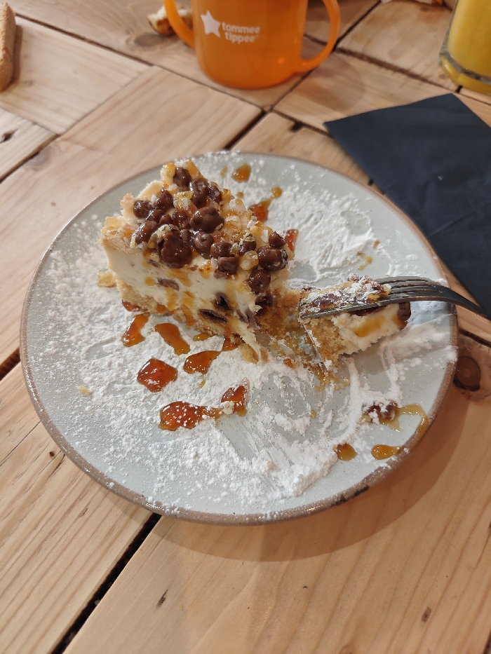 The image displays a close-up, elevated view of a partially consumed dessert on a light-toned wooden plank table. The primary subject is a slice of cheesecake, approximately half-eaten, positioned on a round, light blue-grey ceramic plate with a brown rim. The cheesecake exhibits a biscuit crust, a creamy white filling, and is generously topped with small, dark brown, spherical chocolate pieces and lighter, granulated caramelised fragments. Several irregular drizzles of amber-colored syrup, likely caramel, are present on the cheesecake and scattered across the plate. White powdered sugar is unevenly dusted on the plate, surrounding the dessert. A silver-colored dining fork is inserted into the eaten section of the cheesecake, lifting a small, crumbly portion. In the blurred background, an orange Tommee Tippee branded sippy cup with white text and a star logo is visible to the upper-left. A folded dark rectangular napkin lies on the table to the upper-right, adjacent to a partially visible glass containing an amber-yellow liquid. A light-colored rectangular food item, possibly toast, is partially visible on the far left. No individuals are present in the frame. The immediate environment is an indoor setting with artificial lighting. The image content provides no specific visual identifiers to confirm its location within the city of Stockport, United Kingdom.