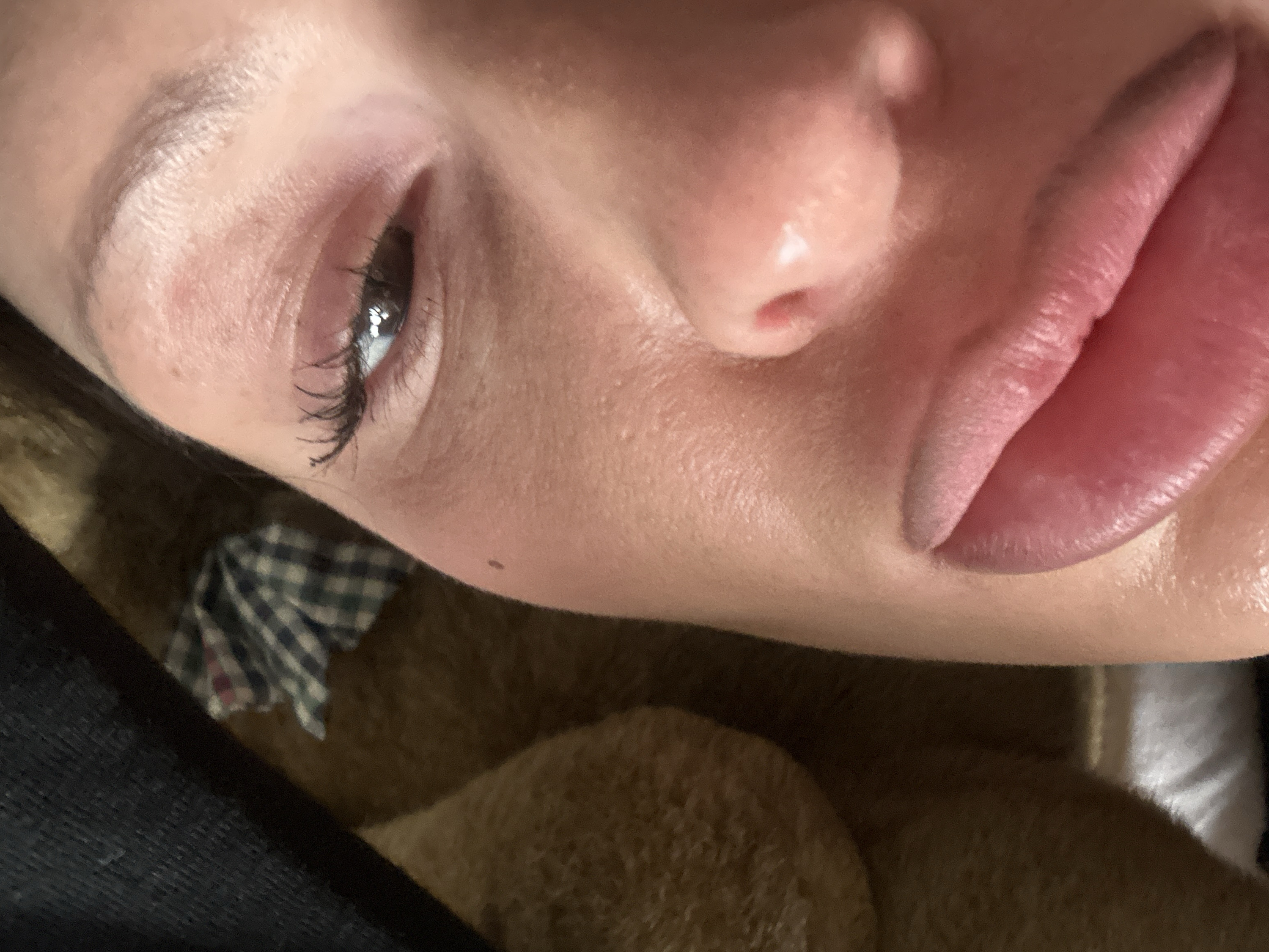 The image depicts a close-up, diagonal view of the right side of an individual's face in an indoor setting within Tunbridge Wells, United Kingdom. The subject's right eye, with dark eyelashes coated in mascara, is partially visible, showing a dark iris and pupil with a light reflection. The right eyebrow is partially visible above the eye. A small, dark mole is present on the upper cheek beneath the outer corner of the eye. The right side of the nose, including the nostril and tip, is visible. The mouth is slightly open, revealing full upper and lower lips. The individual's skin appears smooth with some minor texture. To the left and slightly behind the face, a section of a dark, textured fabric is visible, possibly a garment. Further left and behind the head, a brown, textured object, likely a stuffed animal, is partially visible, featuring a small blue, white, and red plaid bow tie or ribbon. A lighter, possibly white, fabric surface is present below the brown object. The scene is lit indirectly, casting subtle shadows.